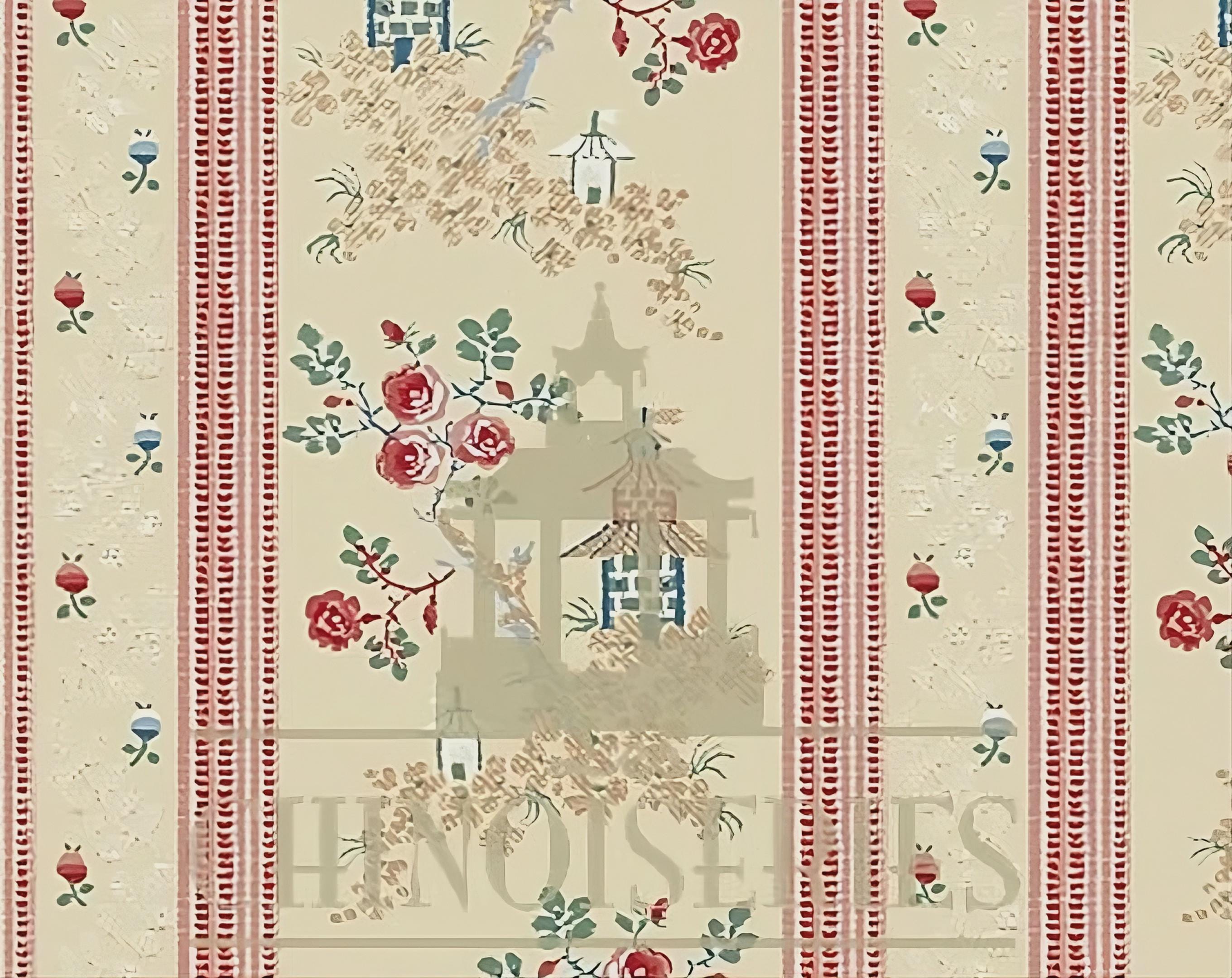 Colorful pagodas. Red roses. Textural red geometric stripes. This is a very cheerful paper with the chinoiserie that has been enjoyed by designers for centuries.