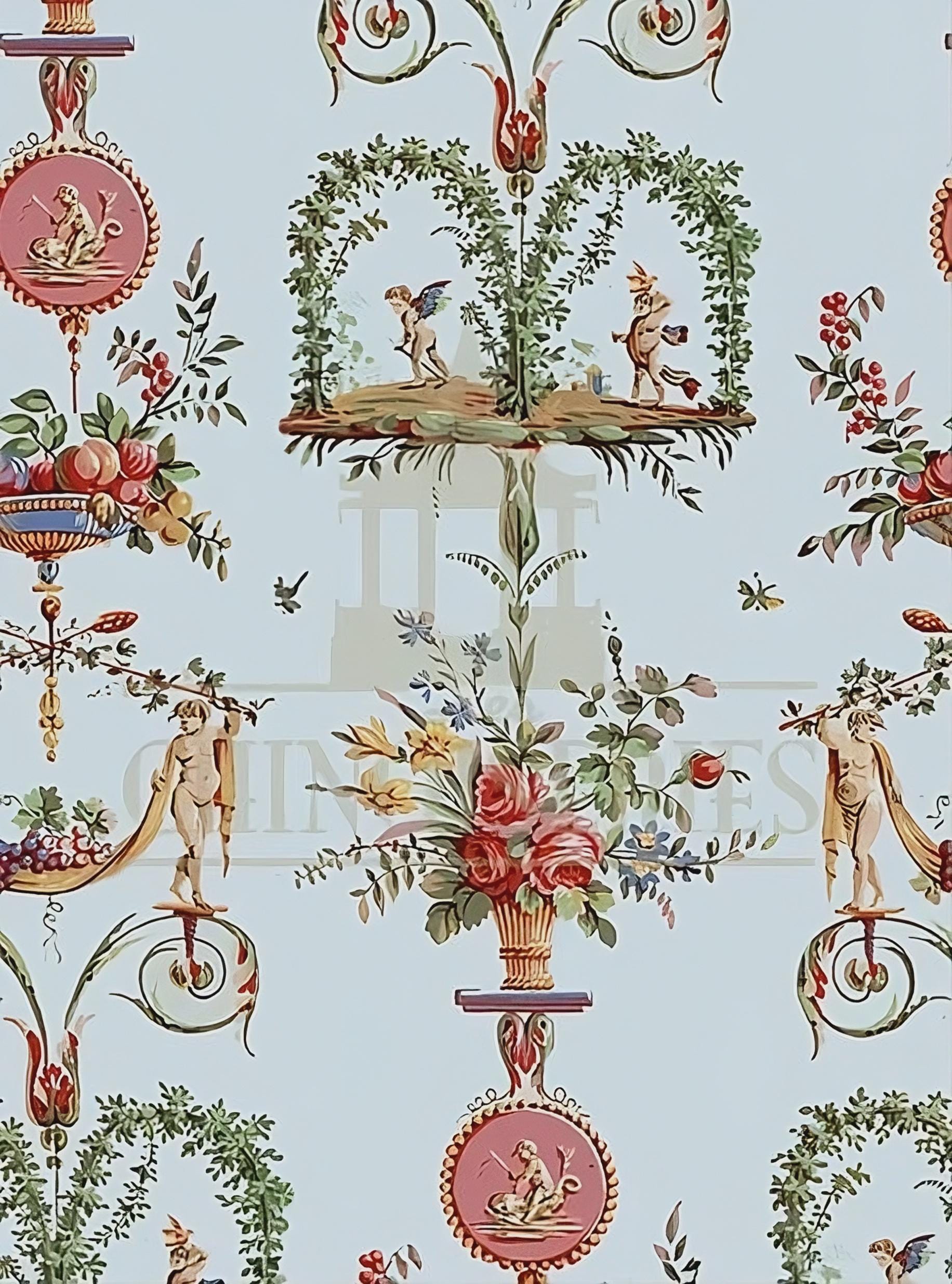 Sky blue background with angels, vases, medallions. Reveillon. French. CXVIII. Measures: 11.8” x 17.7” (30cm x 45cm)Http://www.MiniatureRoseGarden.com