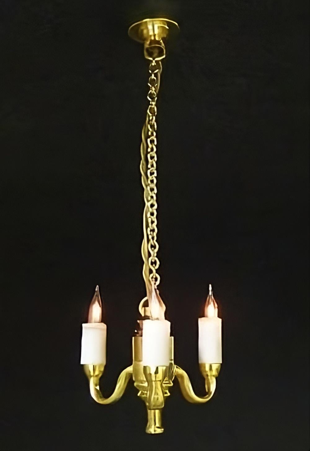 1:24 scale Chandelier for 12 volt systems. 3 arm/3 candleBulbs included. Replaceable. Measures: 3/4” wide (1.9cm)Http://www.MiniatureRoseGarden.com