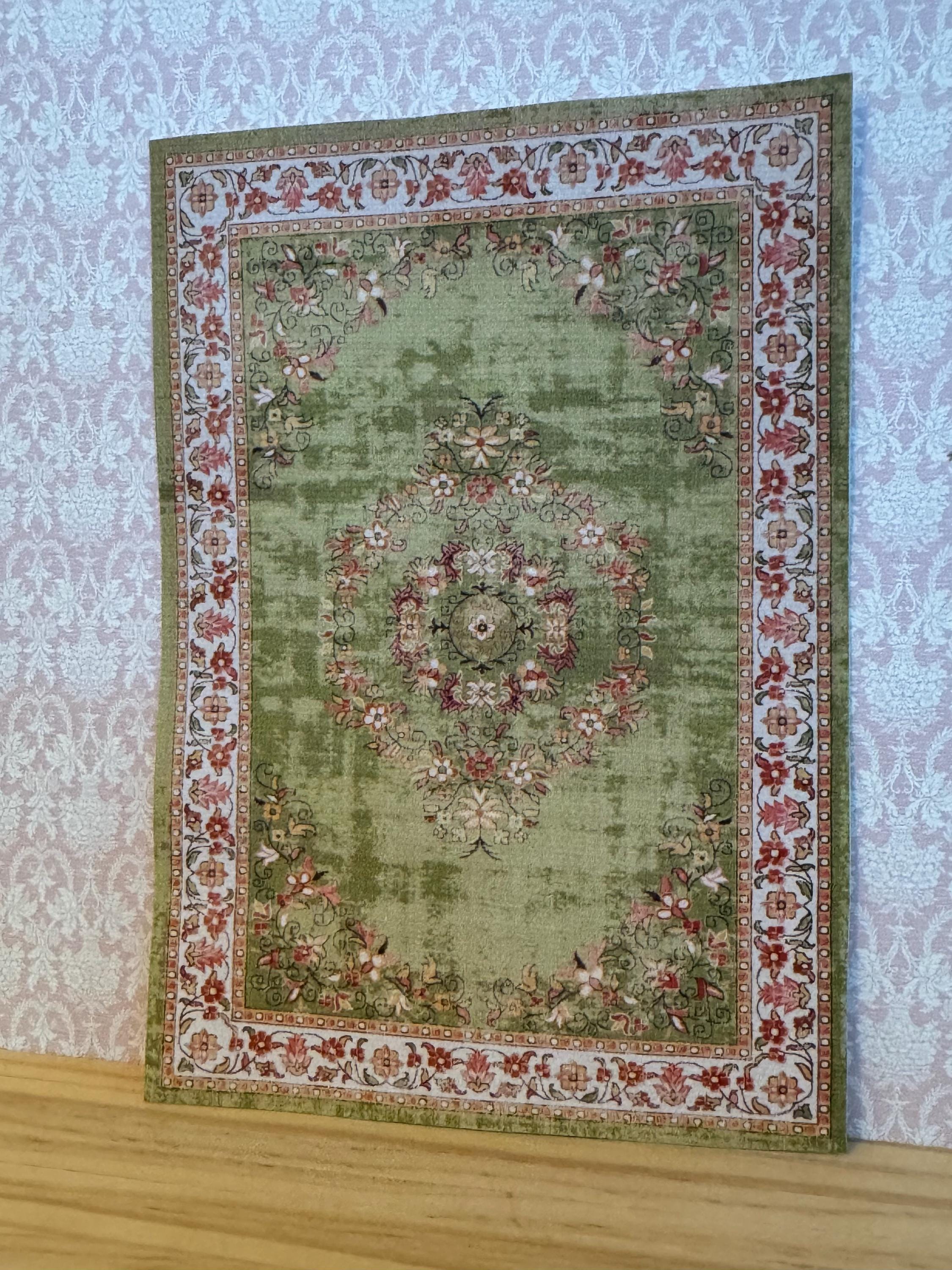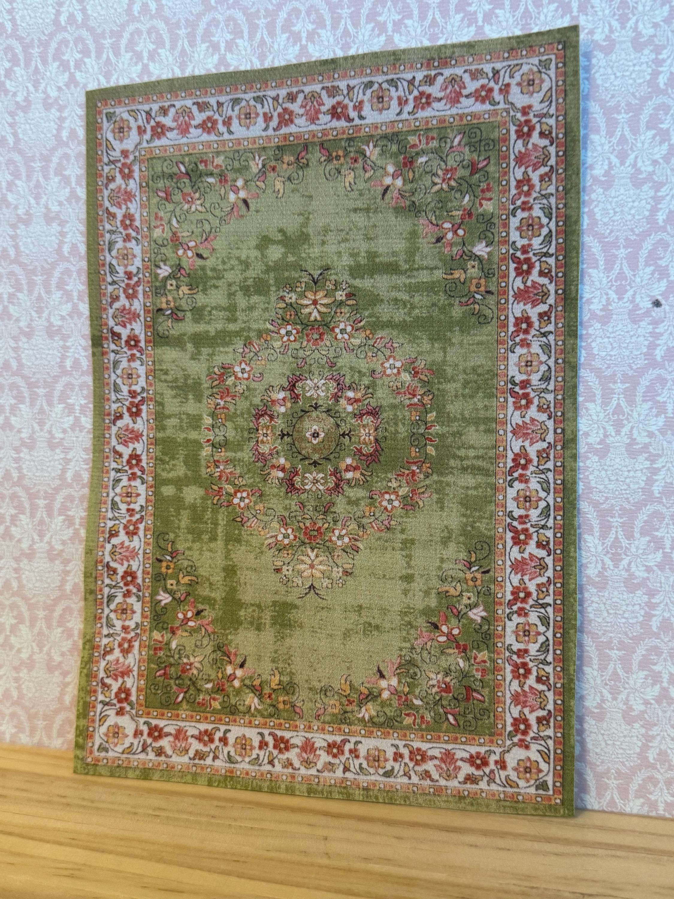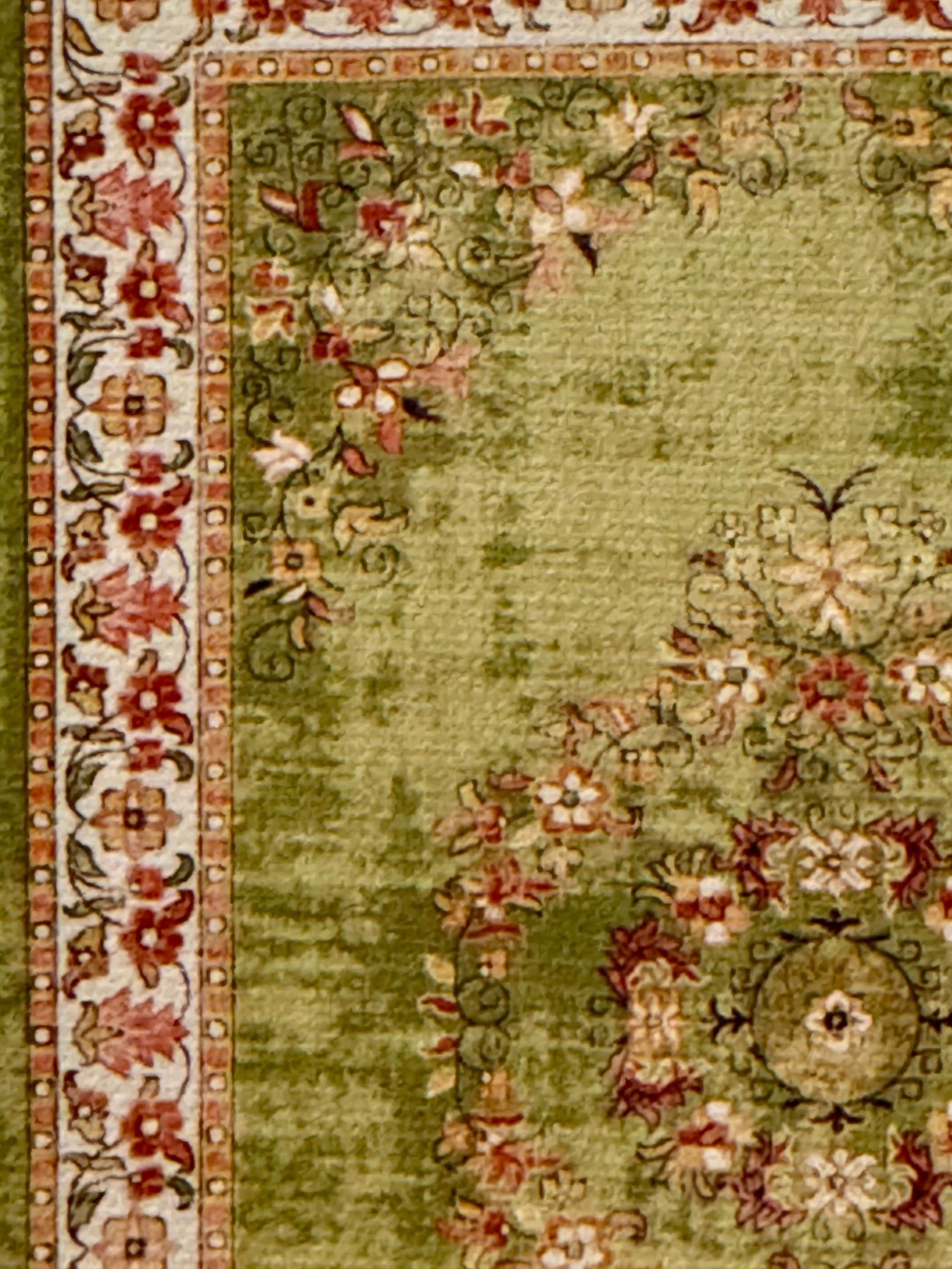 Vintage & oriental inspired carpet. Floral & fun. Orange & yellow flowers border a soft green.
