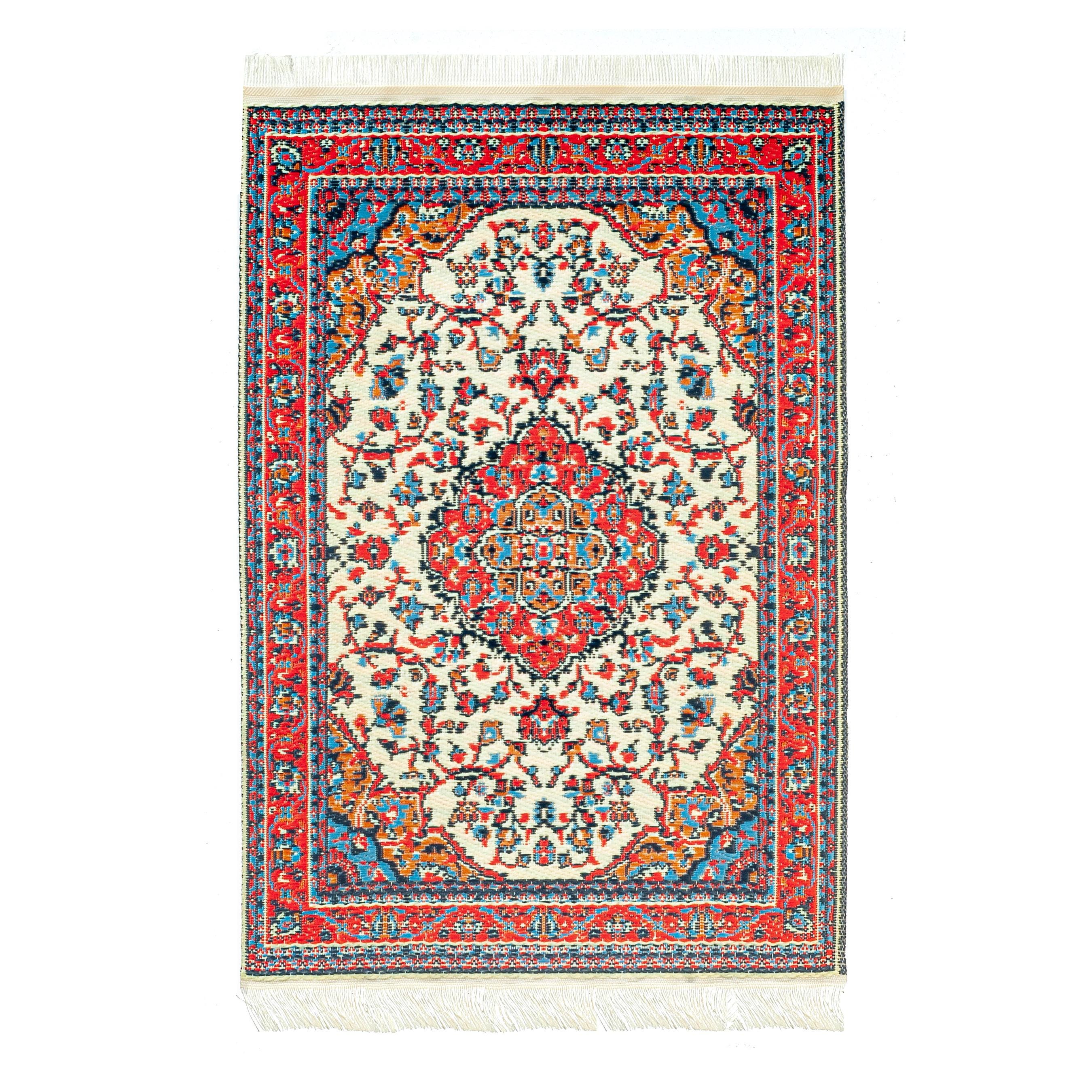 Gorgeous red & blue silky oriental rug with delicate ivory fringe. Measurements: 3 7/8” x 6 5/16” incl fringe (9.8cm x 16cm)Http://www.MiniatureRoseGarden.com@MiniatureRoseGardenHttp://www.MiniatureRoseGarden.blogspot.com