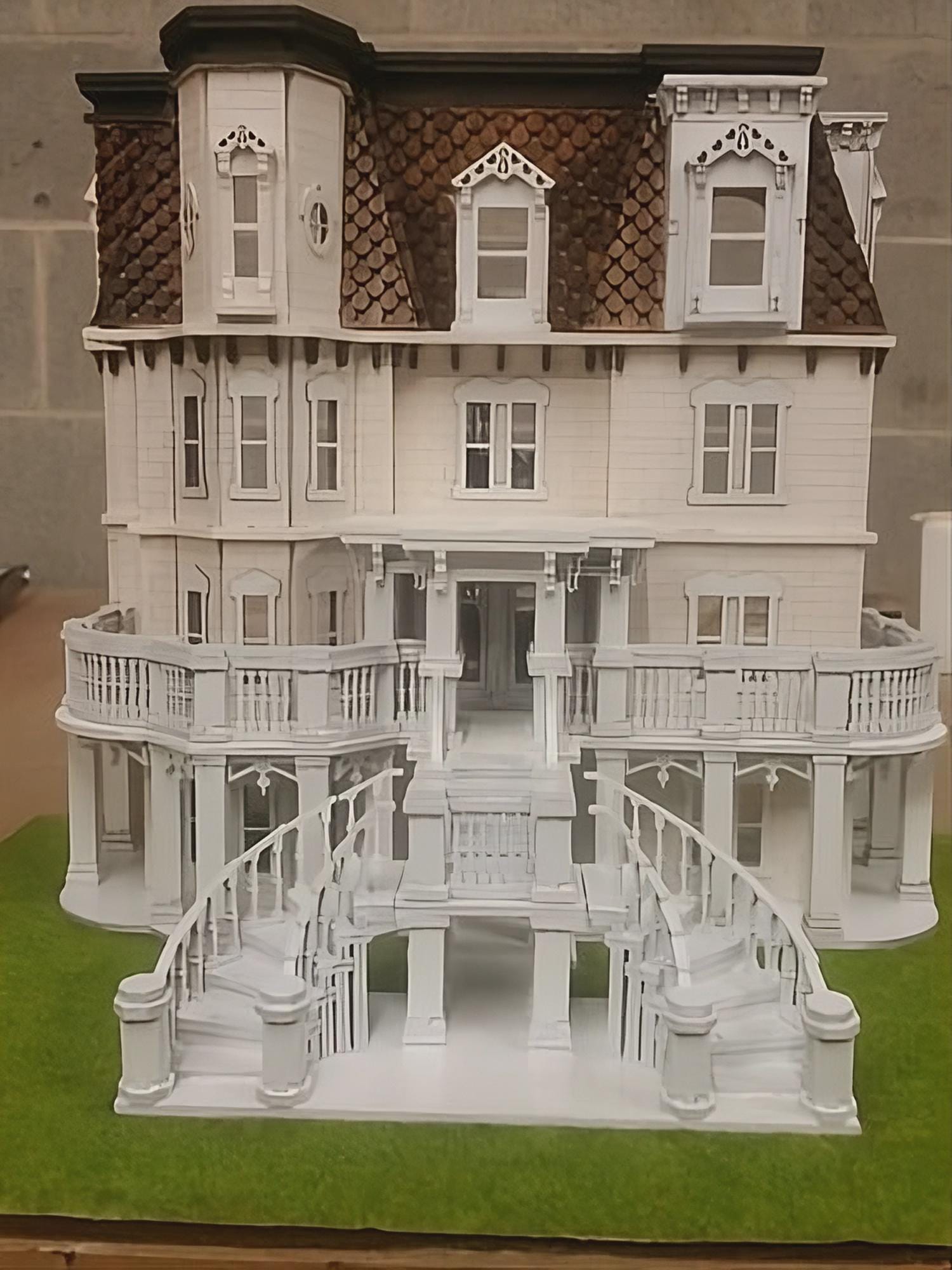 This dollhouse kit is complete with working interior doors, Main Entry door, side exterior door, all shingles pre-cut for fitting the roof, plexiglass, frames, stairs and rails.
