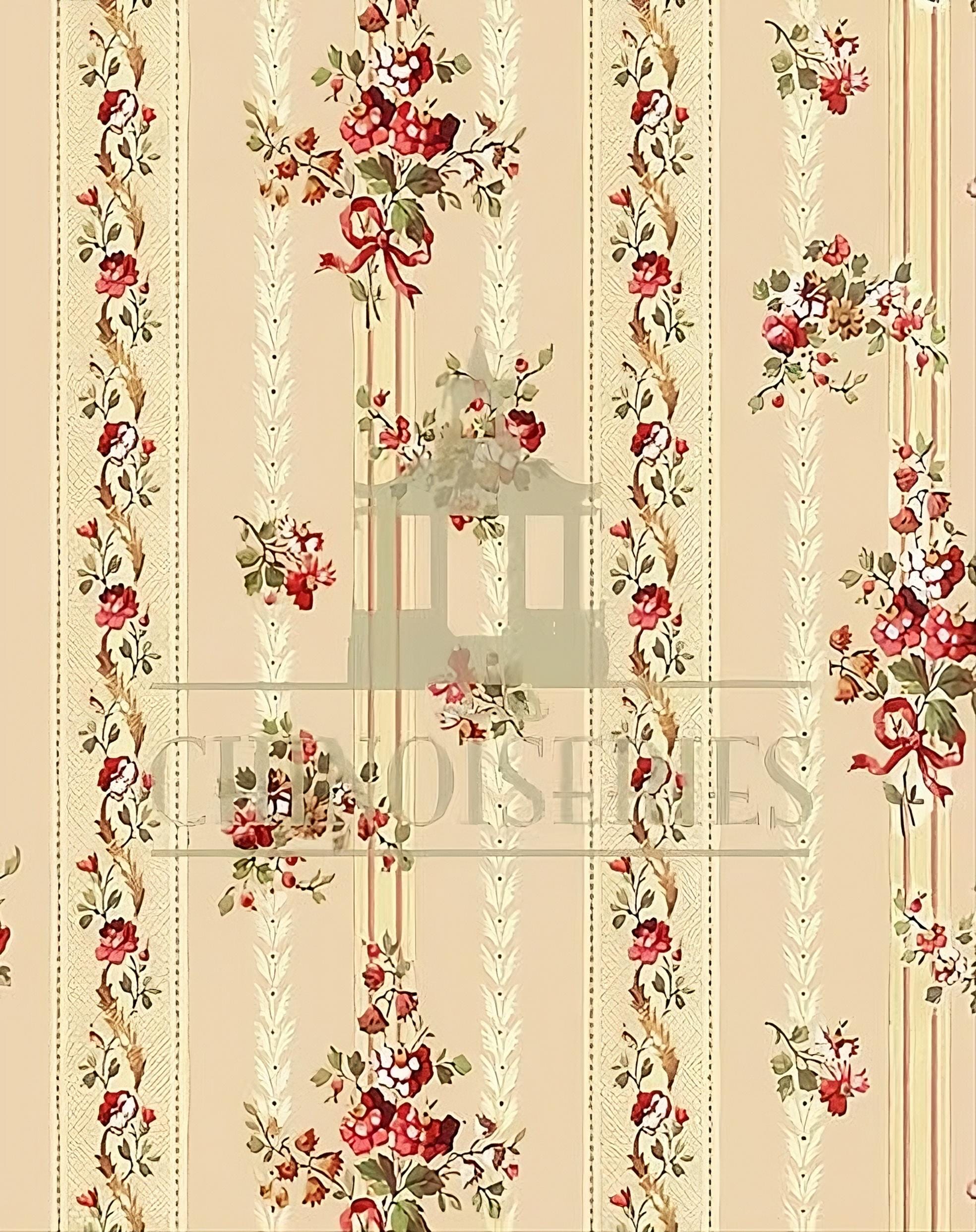 With the overall structure of a geometric stripe pattern & softened by the feminine ease of petit red rose clusters, this paper lends a gentle glow to your Decor with its warm & charming yet neutral peach ground.