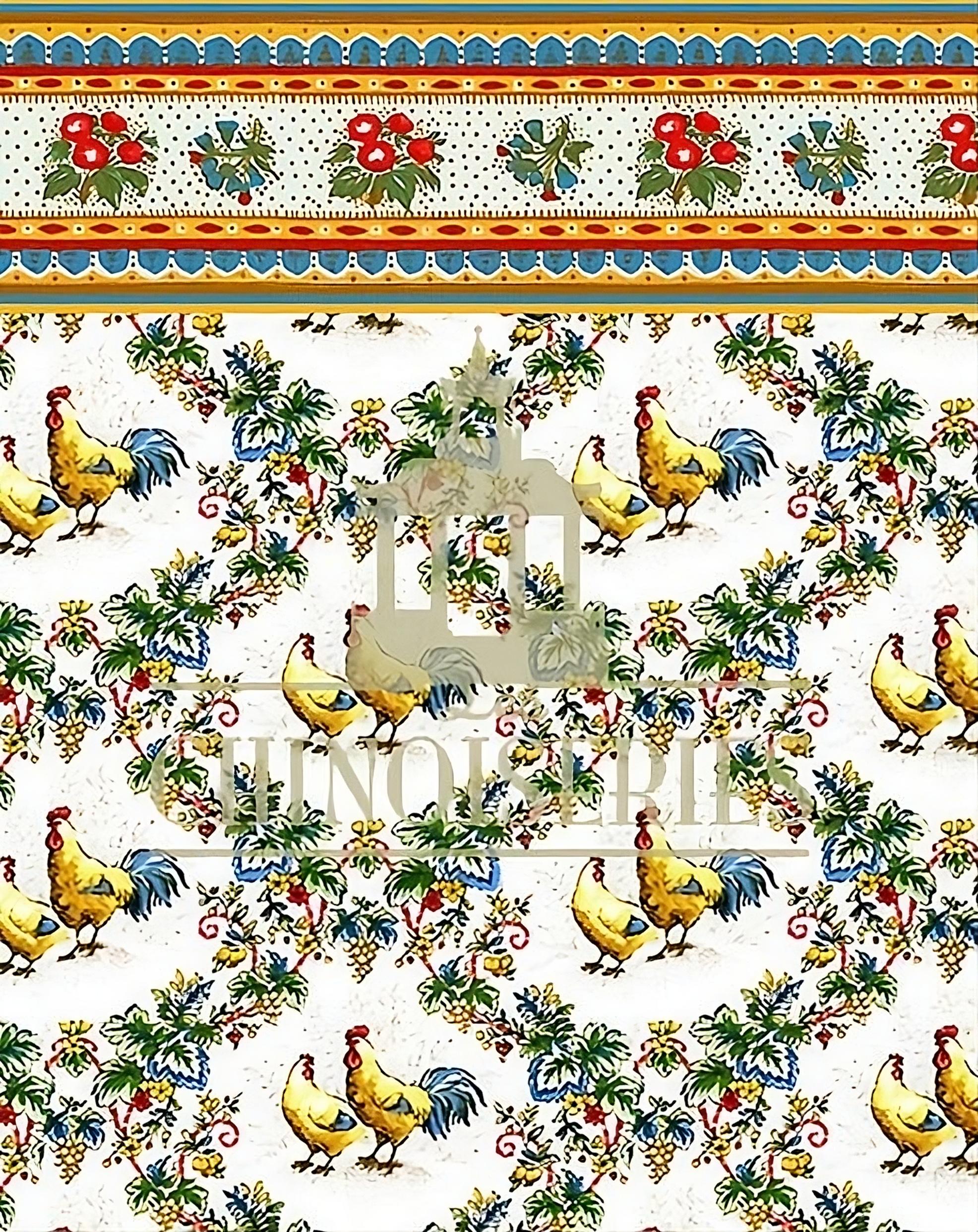 Provence is the definition of French Country Style with a charming border of Red primrose. An espalier of grape vines lends geometric pattern & interest. Chickens & roosters add classic whimsy. The colors are crisp, clear & cheerful with Red, blue, green & yellow on a white backgound.