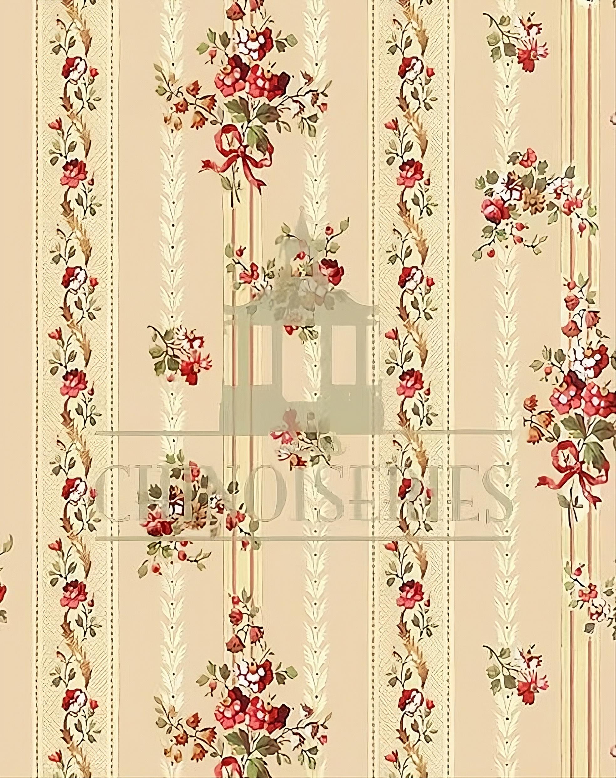 With the overall structure of a geometric stripe pattern & softened by the feminine ease of petit red rose clusters, this paper lends a gentle glow to your Decor with its  warm & charming yet neutral peach ground.