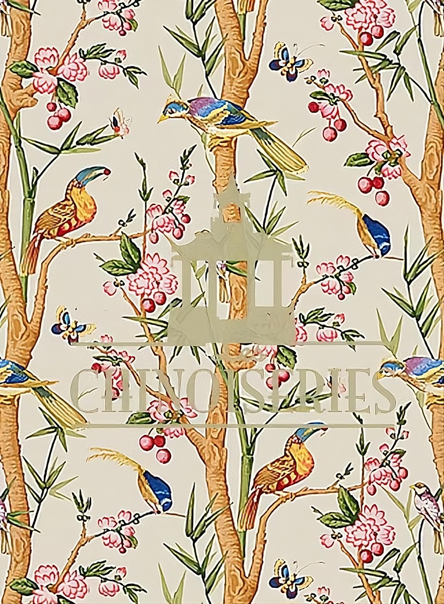 Exotic birds frolic, perhaps playing a game of Telephone, amongst pink flowers on stalks of rattan palm.