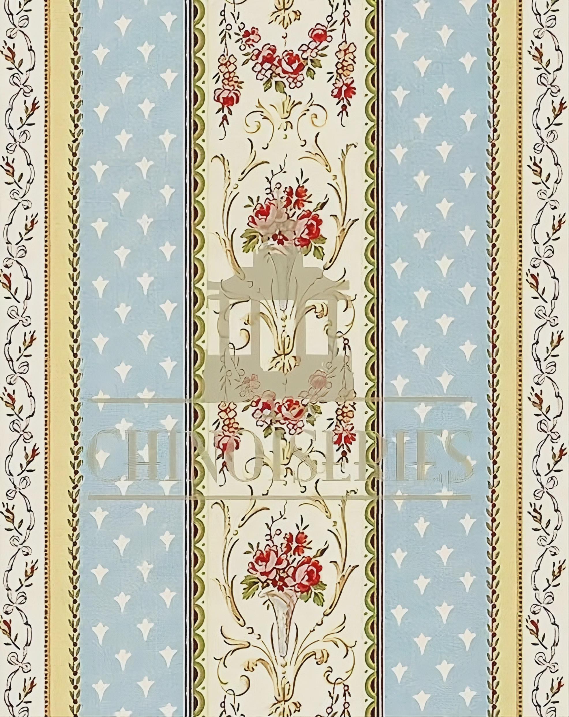 Claire is a charming vintage design offering the structure of geometric stripes along with the romance of pink roses.